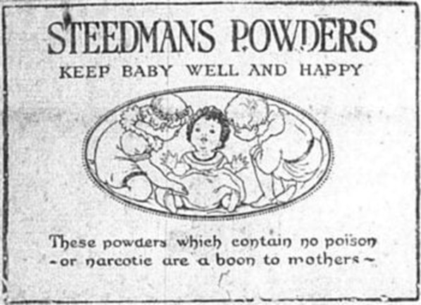 Steedman’s Soothing Powders were used to relieve symptoms of gum inflammation and teething. The resulting symptoms (fevers, convulsions, diarrhea and paralysis) were blamed on the polio virus.  The formula was a mystery until 1909 when scientists discovered it contained calomel (MERCURY) which was not removed until 1940. The original formula included OPIUM.  It is interesting that it was advertised as safe and containing NO poison or narcotic! “The mantra “safe and effective” was used back then. No wonder these treatments calmed and soothed the teething baby with ingredients like opium and morphine!